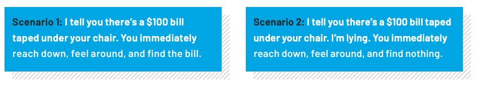 Scenario 2: I tell you there’s a $100 bill taped under your chair. I’m lying. You immediately reach down, feel around, and find nothing.