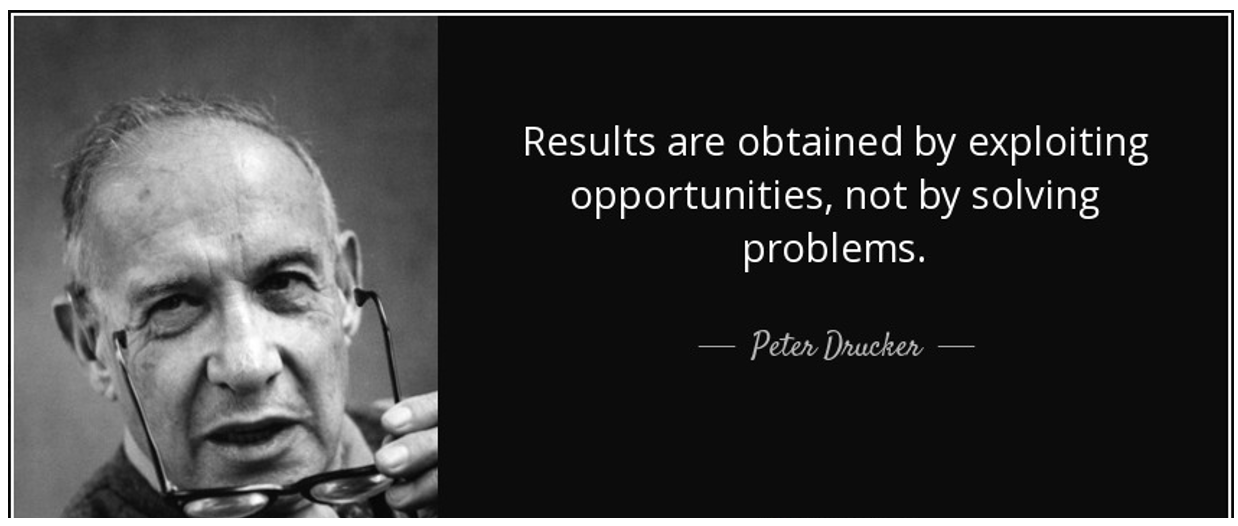 As Peter Drucker, social ecologist and the “father of modern management” wrote, “Results are obtained by exploiting opportunities, not by solving problems.” 7